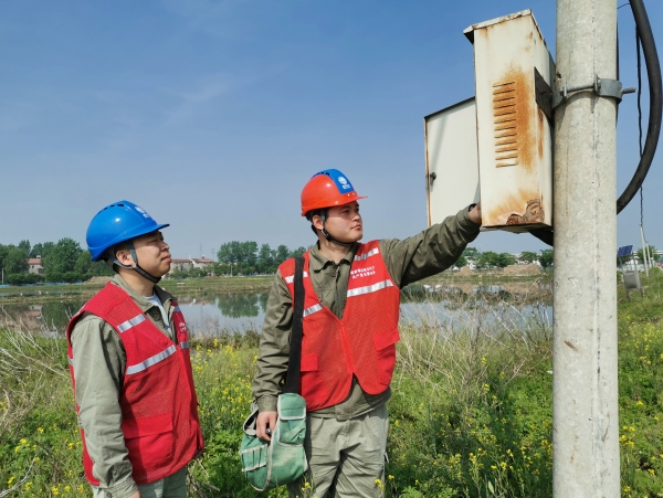 本网讯记者邬玲玲通讯员余寒雨报道:4月22日,宜城市供电公司小河供电所党员服务队来到辖区内的湖北楚绿虾稻科技有限公司养殖基地,检查电力设施。在基地抽水泵站,随着电机开关按下,汩汩清水从汉江提起,缓缓流入虾稻养殖基地。
