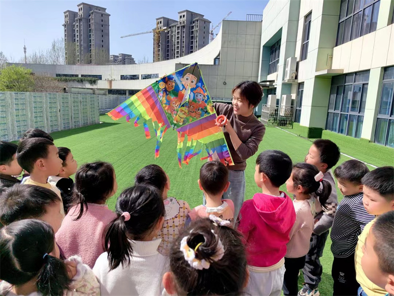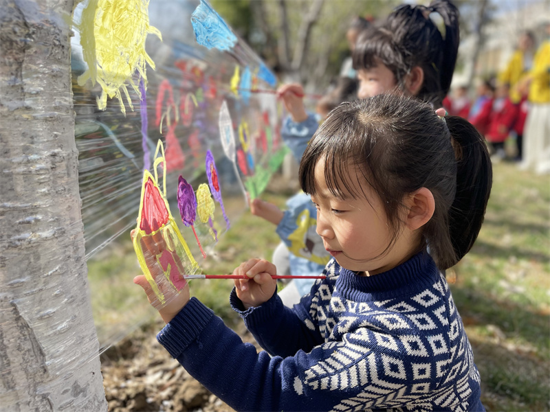 老师们根据孩子们的年龄特点,按年级组开展了赏花、放风筝、薄膜画春、树叶喷画等探春、觅春、绘春、展春系列活动。小班孩子们在校园里闻着花香、抚摸嫩芽感受春天的芬芳;中班孩子们跟着老师手持风筝线,迎风奔跑,享受春天的欢快;大班的孩子们手拿画笔、颜料,在薄膜上将眼中所看、心中所想的美丽春天景色绘成一幅幅精彩的画作。