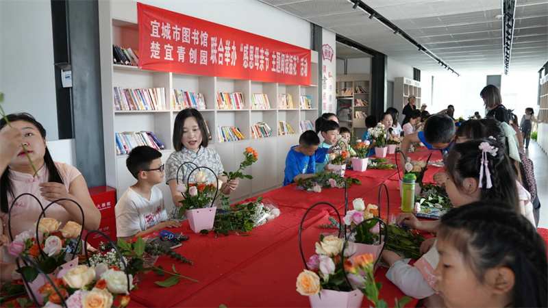 本网讯记者邬玲玲 通讯员熊辉报道:5月14日母亲节当天,宜城市图书馆联合楚宜青创园,在园内城市书房开展"感恩母亲节"主题阅读插花活动,共有20位妈妈带孩子参加此次活动。