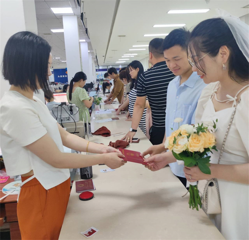 本网讯通讯员丁力 周玉香报道:今年的“520”恰逢周末,为满足广大新人的结婚登记需求,当天,宜城市婚姻登记处提前通过媒体告知市民,婚姻登记“不打烊”,加班为新人办理结婚登记。5.20当天迎来了结婚登记的小高峰。