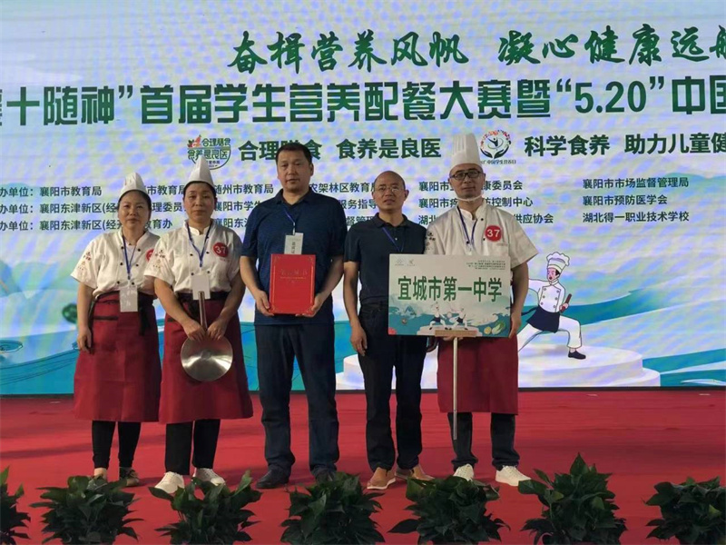 宜城一中代表襄阳市参加高中组比赛,3位员工用科学的营养知识、精湛的厨艺,烹制出色香味俱全的学生营养餐,得到评委一致好评,最终从38支代表队中脱颖而出,获得一等奖。
