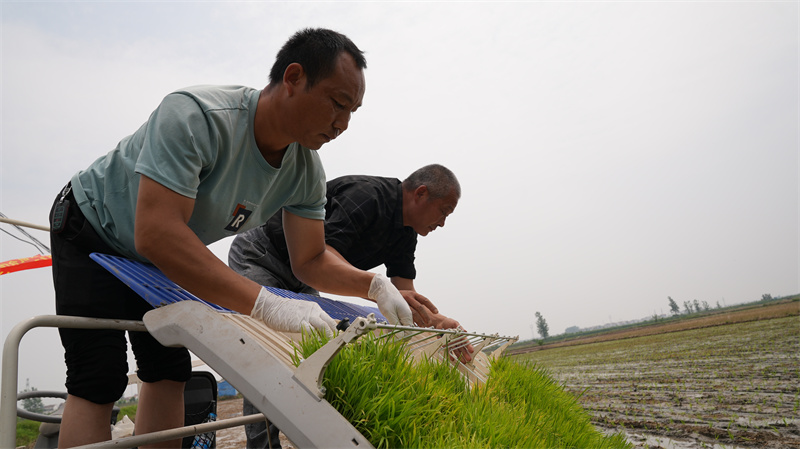 当前正是水稻插秧时节。这两天,宜城市杨光农机专业合作社托管的12000亩早稻田正在插秧。在郑集镇双龙村村民程大国的秧田里,一盘盘秧苗在农机手的操作下,均匀整齐地插在田间,又快又好。和往年的机械化插秧相比,专业农机手使用的智慧化高速插秧机效率提升了3至5倍。