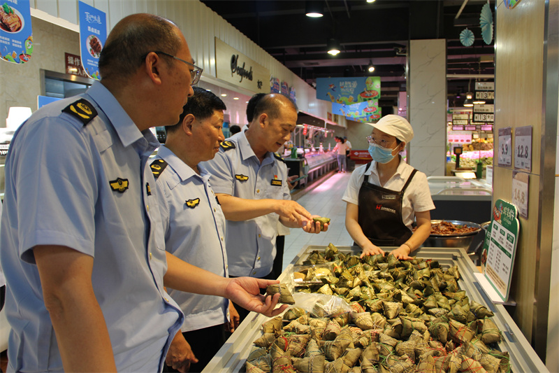 针对节日食品消费特点,此次检查围绕粽子、咸鸭蛋、乳制品、粮油、肉蛋等热销品种,执法人员深入商超、农贸市场、杂食店等场所,检查经营者是否落实进货查验、索证索票制度,查看在售食品包装标识信息、散装食品储存是否规范。对检查发现的商品标签标识不全、“三防”设施不到位等问题,执法人员责令经营者立即整改,要求企业切实履行食品安全主体责任,严把进货关、规范经营行为,杜绝销售“三无”食品、假冒伪劣食品、过期食品,做到明码标价,规范节日期间食品市场经营秩序。同时,市市场监管局还对粽子开展抽检,目前共检测10批次。