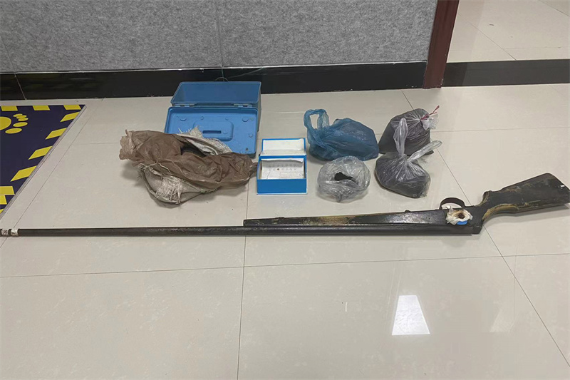 宜城市公安局板桥店镇派出所民警在入户走访时获悉,村民邱某可能私藏猎枪。为此,联合刑侦大队果断出击,火速赶到邱某家中。其当即如实供述,称枪支弹药是外公去世前作为遗物送给他,想作纪念就留至今日。在邱某带领下,民警分别在卧室床下、客厅柜子查获土铳猎枪1把,及火药、铁弹子、火药炮若干。