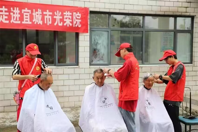 当天上午9:00,志愿服务队志愿者们或身着"红马甲",或身穿白大褂来到市光荣院,按照分工,医护人员为光荣院老人逐一测量血压、查心率,耐心问诊,细致理疗,免费赠药;青年理发师根据老人们的理发需求,为老人们打理出称心、实用的夏日发型。市关工委、市慈善总会相关负责人为市光荣院老战士送上大米和食用油,先后走进现年97岁的退役老兵温永泉和已故复员军人尹继寿的老伴艾安翠的宿舍,为两位老人送去牛奶、点心,倾心与两位老人交谈,逐个了解他们的健康状况和生活情况,叮嘱老人要保重身体,保持健康乐观的生活态度,帮助老人整理床铺,并向老兵致以节日的真挚问候。