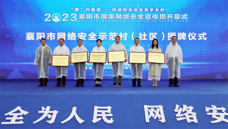 开幕式现场,襄阳市委常委、宣传部部长陈剑,省委网信办二级巡视员唐兵,襄阳市委网信办主任靖德兵,宜城市委书记武义泉,宜城市委常委、宣传部部长蒙谨共同启动"2023年襄阳市国家网络安全宣传周";唐兵、靖德兵共同为2023年度襄阳市网络安全宣传示范村(社区)代表授牌。