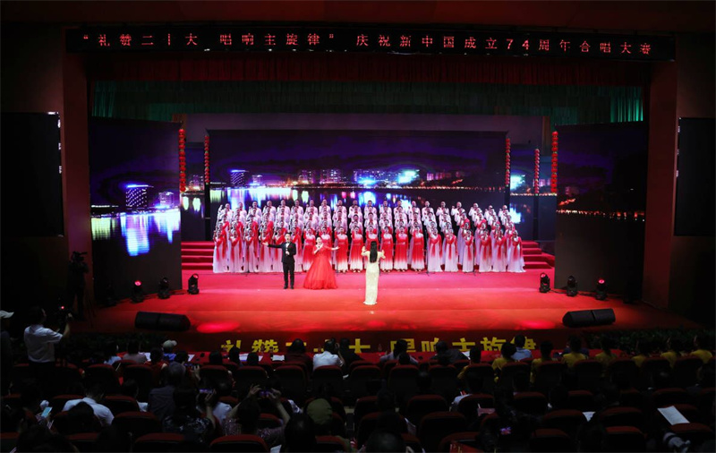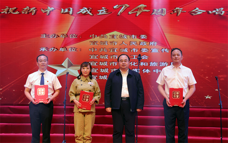 本网讯记者李勤 周波报道:花好月圆迎中秋,楚都飞歌颂国庆。9月28日,由宜城市委、市政府主办,市委宣传部、市总工会、市文化和旅游局、市融媒体中心、市文联承办的“礼赞二十大唱响主旋律”庆祝新中国成立74周年合唱大赛决赛在楚都文化中心举行。武义泉、肖平、陈进雷、李源等市“四大家”领导观看了大赛,并为获奖合唱团颁奖。