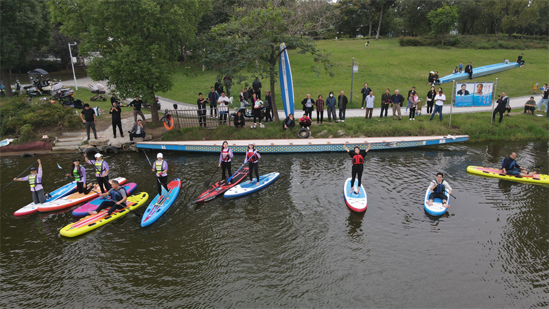 桨板运动爱好者郭宜红是第一次玩桨板,她高兴的说:“迎国庆,玩桨板,这个运动非常好,能强身健体增强身体素质,锻炼了我们的身体,身心也非常愉悦。”