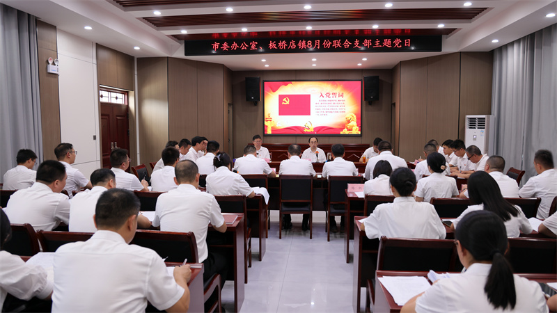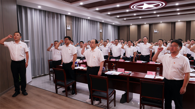 武义泉与全体党员齐唱国歌、重温入党誓词。市委办肖丽丽、板桥店镇朱忠仁分别围绕学习贯彻党的二十届三中全会精神作交流发言。