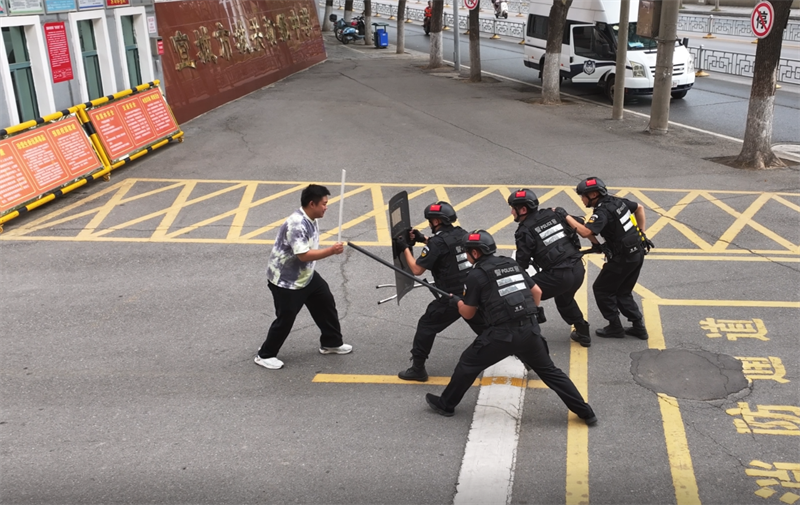 ÑÝÁ·ÒÔ¡°Ä£Äⳡ¾°£¬ÊµÕ½ÑÝÁ·¡±µÄ·½Ê½À¿ª£¬Ò»Ãû¡°±©¿Ö¡±·Ö×ÓÒÔ¸øÑ§ÉúËͶ«Î÷ΪÓÉÓûͼ´³½øÐ£Ô°£¬±£°²Ñ¯ÎʾßÌåÐÅÏ¢£¬¸ÃÄÐ×ÓÖ§Ö§ÎáÎá»Ø´ð²»ÉÏÀ´£¬ÄÐ×Ó¼û²»ÄÜÁï½øÑ§Ð££¬±ãÄóöËæÉíЯ´øµÄµ¶Ó²´³ÈëѧУ²¢Ï®»÷±£°²£¬±£°²Ò»±ßÓëÆäÖÜÐý£¬Ò»±ßÆô¶¯Ò»¼ü±¨¾¯ÏµÍ³£¬Û³³ÇÅɳöËùÃñ¾¯½Ó¾¯ºóѸËٸϵ½ÏÖ³¡£¬ÒÔÕ½ÊõС×éµÄÐÎʽ£¬ÀûÓ÷À±¬¶ÜÅÆÑÚ»¤£¬´ÓÈýÃæÎ§¶Â£¬×¥×¡ÓÐÀûʱ»ú´òµô¡°±©¿Ö¡°·Ö×ÓÊÖÖеÄÐׯ÷£¬½«ÆäÖÆ·þºó´øÀëÏÖ³¡¡£