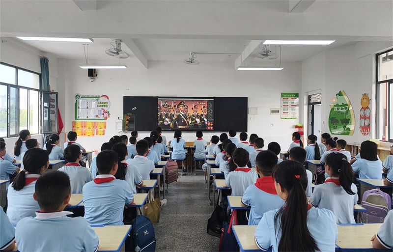 宜城市宋玉小学组织全体师生收看纪念中国人民抗日战争暨世界反法西斯战争胜利80周年大会直播。