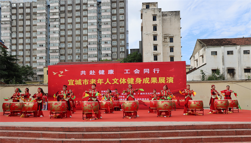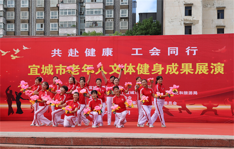 本网讯记者谢子恒报道:9月24日,“共赴健康 工会同行”宜城市老年人文体健身成果展演活动在紫盖山广场举行。