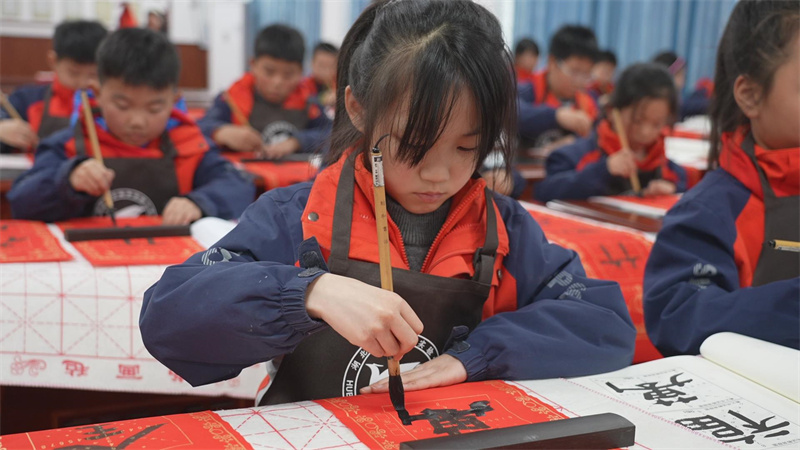 “谁能想到,我这个零基础的小白只花6小时就学会写春联啦!现在我一拿起毛笔就舍不得放下,今年家里和亲戚家的春联准备都由我承包,想想就有成就感!”实验小学五年级(5)班学生张睿宸说。