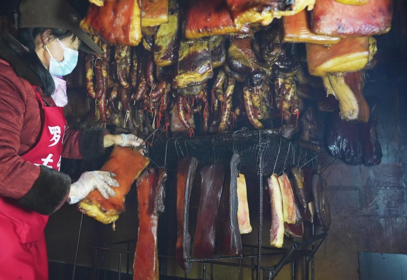 “熏房是最后一道工序,你看这些肉都快熏好了,再过两天就可以进入市场销售了。”在散发着松柏清香的熏房里,罗国会指着即将完成的熏制品,自豪之情溢于言表。