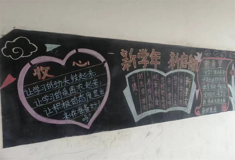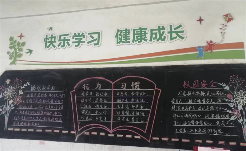 本次黑板报以“新学期,新起点”为主题,以行为规范、心理健康、安全教育等为主要内容。各班在班主任的带领下出谋划策,积极准备,认真设计,按时完成黑板报。