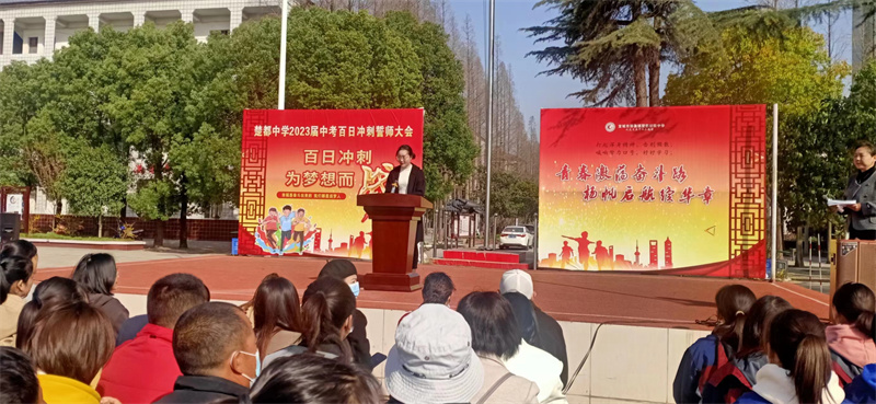 本网讯通讯员肖安军报道:3月13日,郑集镇楚都中学举行2023年中考百日誓师大会,进一步激发九年级学生的学习热情,营造乐观、进取的备考氛围。