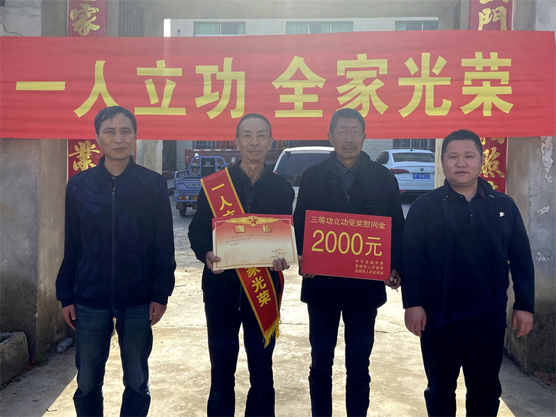 本网讯通讯员曹春燕 冉金刚报道:3月15日,宜城市退役军人事务局联合王集镇退役军人服务站,为王集镇庞居村五组刘桥家属送去三等功喜报。