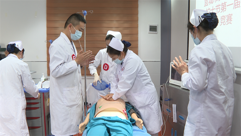 竞赛结束后,6名医护人员还开展了院内急救演练,模拟一名病人心脏骤停,急需心肺复苏急救。抢救中,医生与护士动作敏捷,护士大声复述并认真核对,抢救流程合理,节奏紧凑流畅,各项急诊抢救操作稳、准、快,赢得了现场人员热烈掌声。
