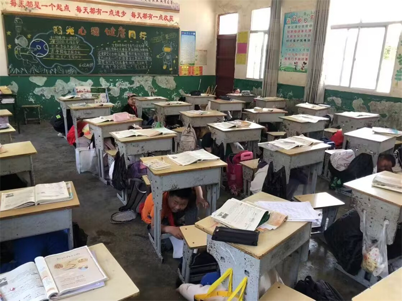 “呜……”随着急促的警报声响起,官堰村小学各班学生闻声而动,迅速钻入桌底。警报声停歇,同学们双手抱头,有序“逃离”,顺利完成演练。