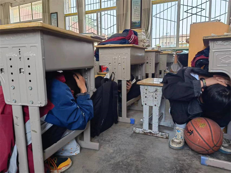 演练中,随着第一声哨响,室内演练开始。相关区域的负责人迅速到达各楼层的指定位置发出紧急信号,所有学生迅速有序地躲到了课桌下面。对学生不正确的动作和姿势,老师一一做了纠正。随后全体学生在老师的引导下,迅速按预定疏散路线撤离教学楼,到达指定的安全地带集合并完成人数清点,整个过程用时1分43秒。
