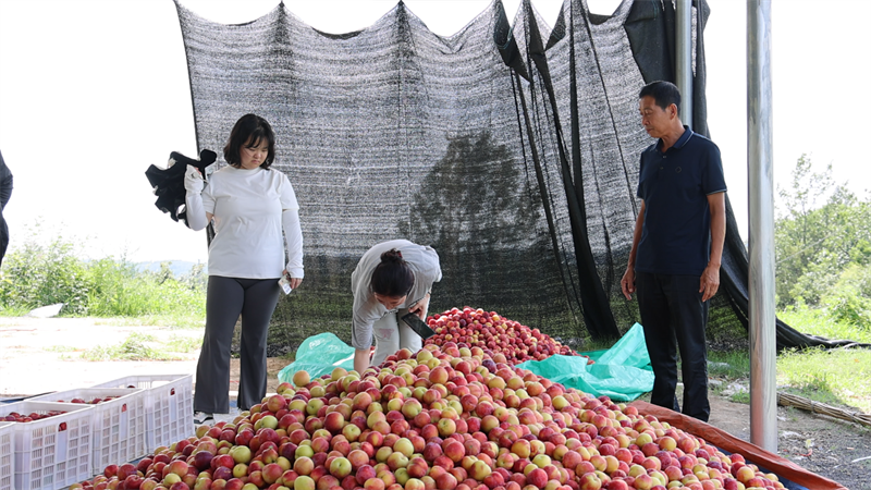 7月6日,在板桥店镇肖云村一处果园,几名村民正顶着烈日,在果园里来回穿梭,采摘李子,现场一片丰收的繁忙景象。