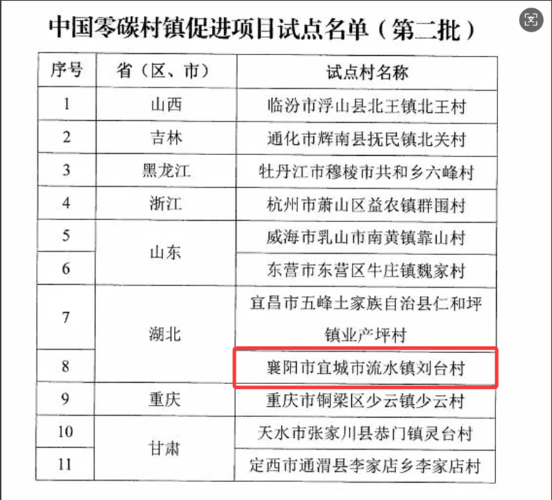本网讯记者刘毅报道:近日,农业农村部公布全球环境基金“中国零碳村镇促进项目”第二批试点村名单,全国共有11个村镇入选,流水镇刘台村成功上榜,湖北省仅2个村入选。